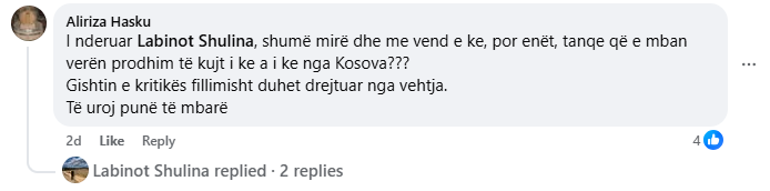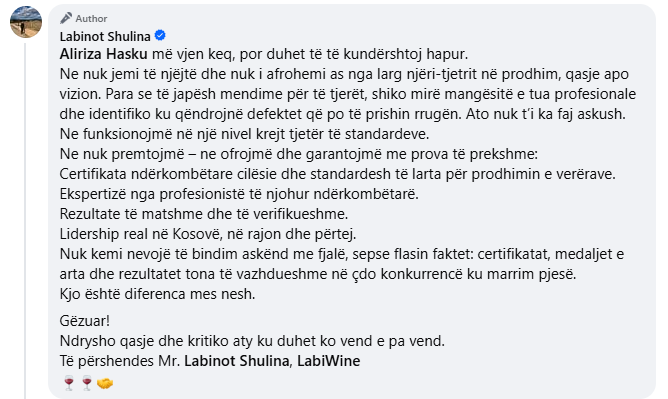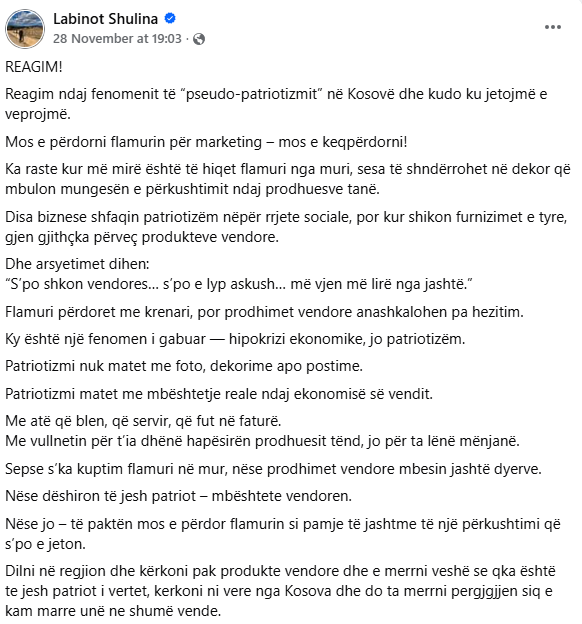 Kjo qasje si duket i ka penguar sipërmarrësit Labinot Shulina, i cili përmes një “reagimi publik” në rrjetet sociale hodhi kritika në drjetim të atyre që me datën përkatëse janë patriot, por iu mungon patriotizmi i vërtetë, duke veçuar atë ekonomik, respektivisht në fushën ku operon.